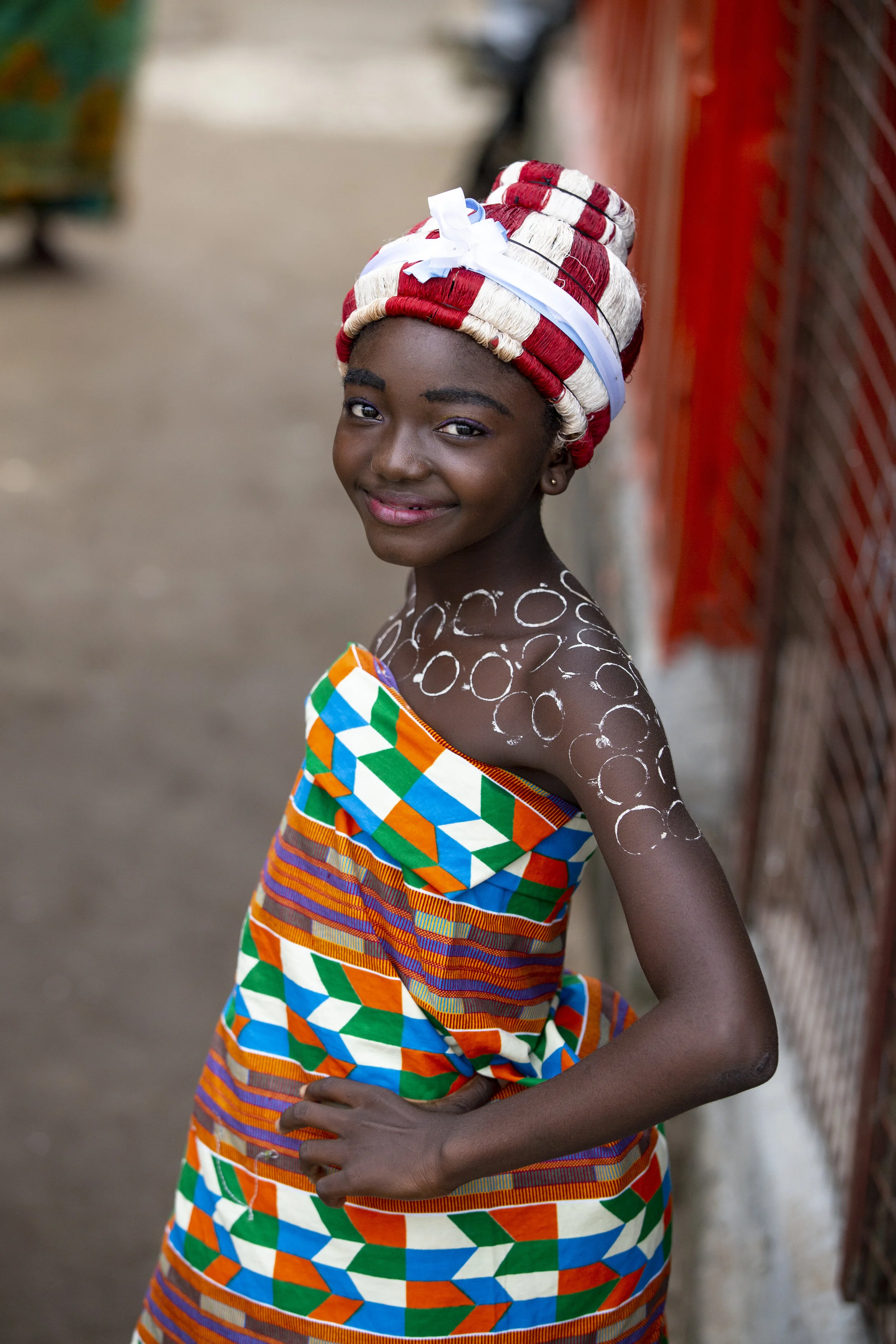 A young girl dressed in colorful traditional African attire with circular white body paint designs on her arms and shoulders, smiling and standing beside a red metal fence. View fullsize