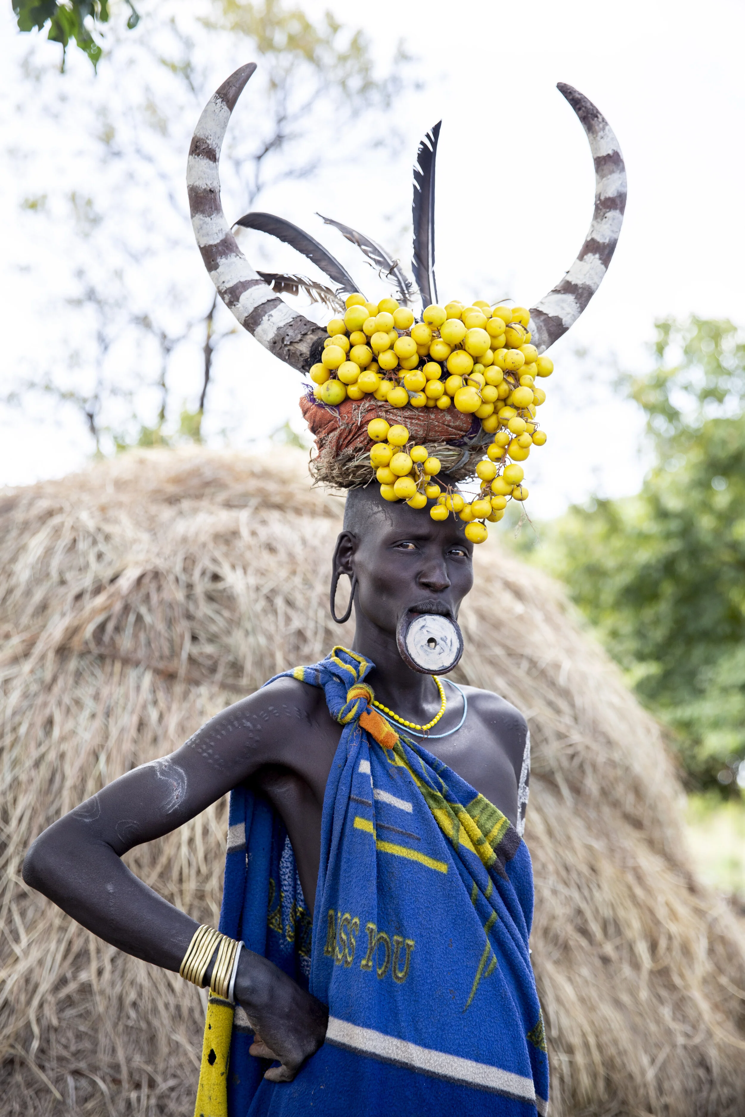 A man from an indigenous African tribe wearing traditional blue cloth with yellow patterns, gold bangles, and a necklace, stands outdoors with a large headpiece made of yellow fruits, feathers, and striped horns, with a thatched hut and trees in the